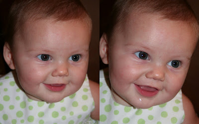 Poor baby fell sound asleep while I was feeding her squash the other night - the funny part was she kept eating with her eyes closed that is why she is so messy bu I couldn't resist a pic then even after I cleaned her up she never woke up - she was so tired - we are still working on taking longer than 45 min naps:)